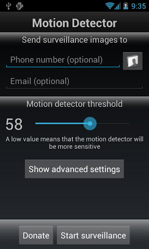 Per attivare il servizio di video sorveglianza su Android dovete installare Motion Detector Pro (Download), un'applicazione che al pari di una fotocellula si attiva appena rivela un movimento, e ci invia un’email contenente anche la foto scattata al ladro.